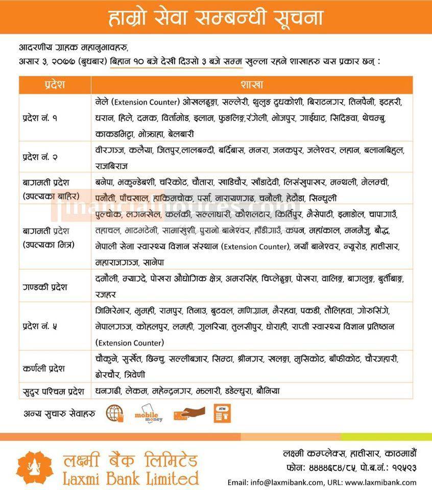 Laxmi बैंकको शाखाहरु खुल्ने सम्बन्धि सूचना