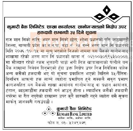 Published by Kumari Bank Ltd (KBL) Official Page on 2077-3-04