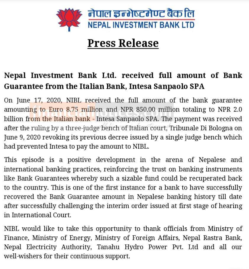 NIBL Received full amount of Bank Guarantee