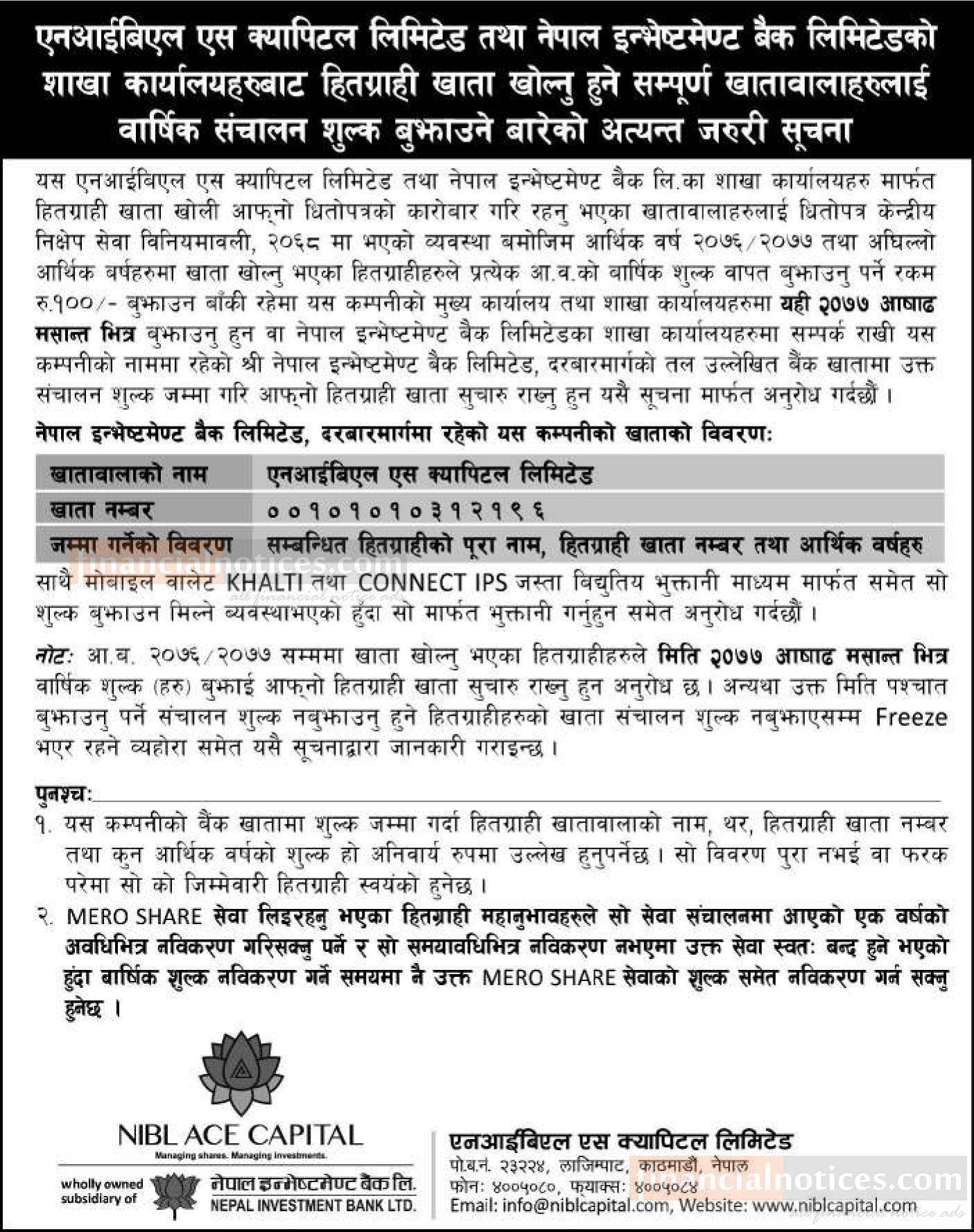 DEMAT A/c वार्षिक संचालन शुल्क बुझाउने बारे सूचना