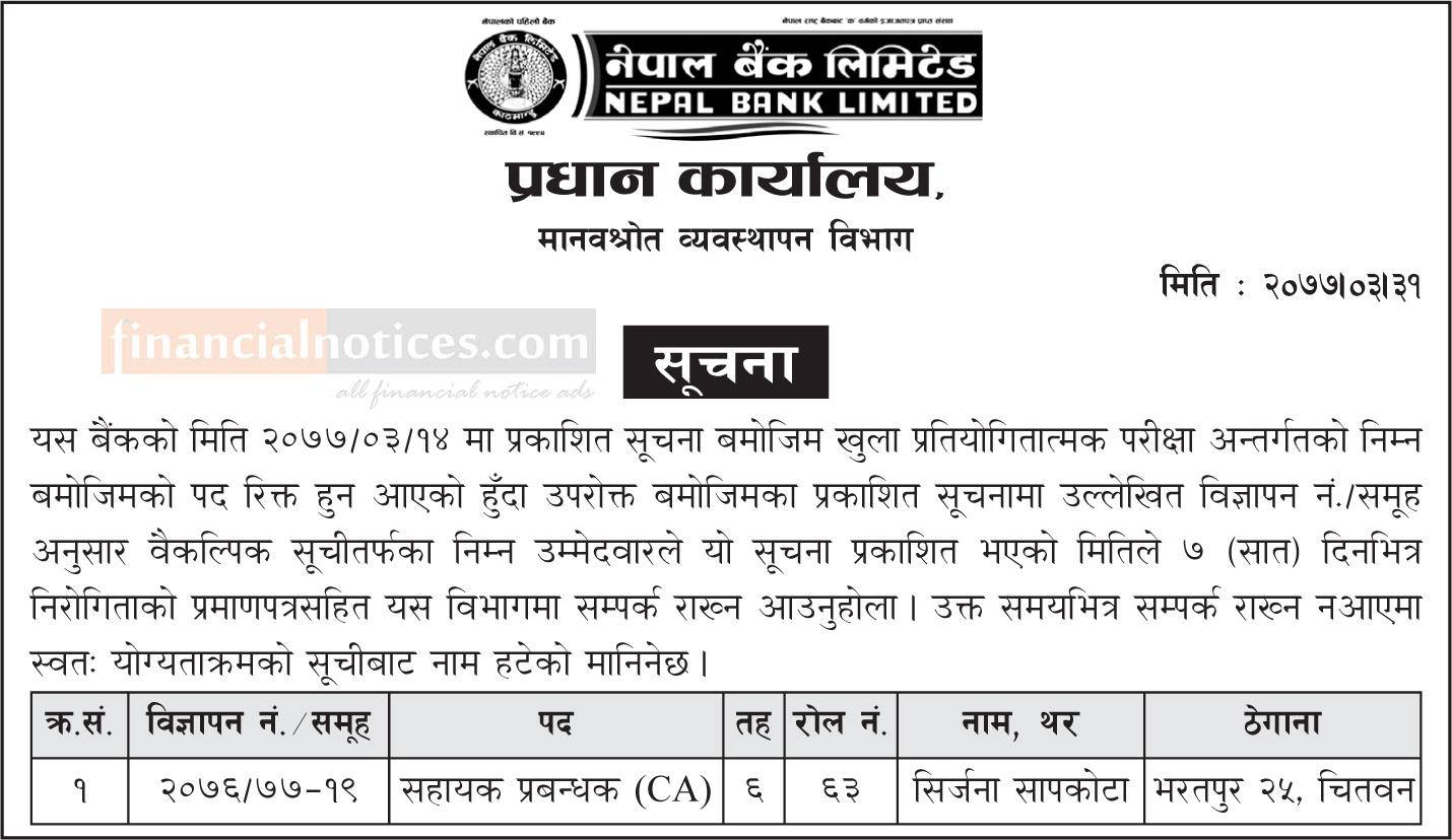 वैकल्पिक सूचिका उम्मेदवारलाई बैंकमा सम्पर्क राख्न अनुरोध