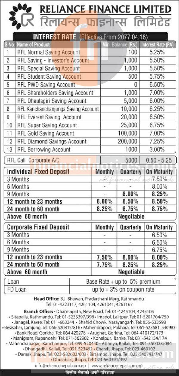 Reliane Finance को नयाँ ब्याजदर सार्वजनिक