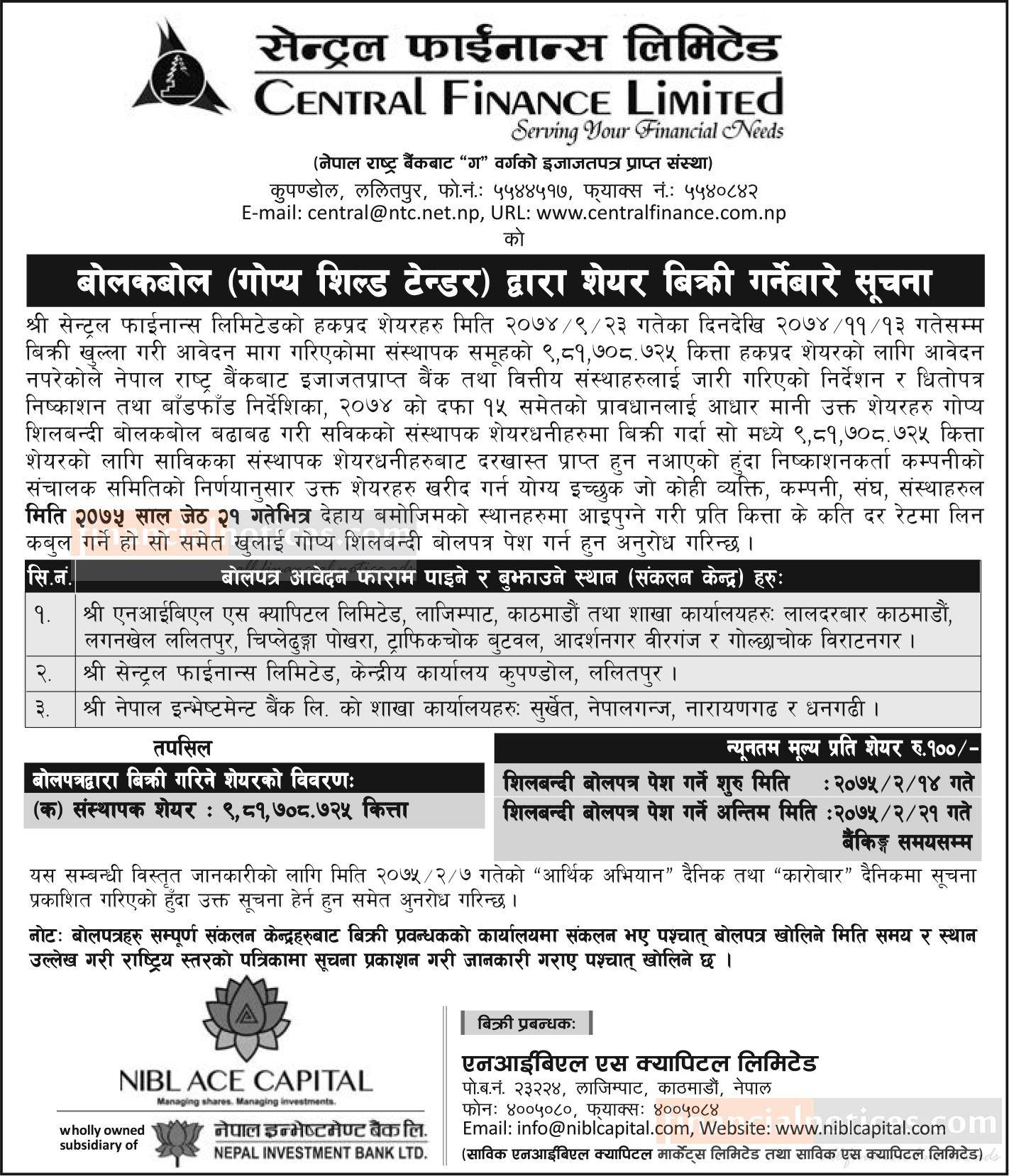 गोप्य सिल्ड टेण्डरद्वारा शेयर विक्रिको सूचना !