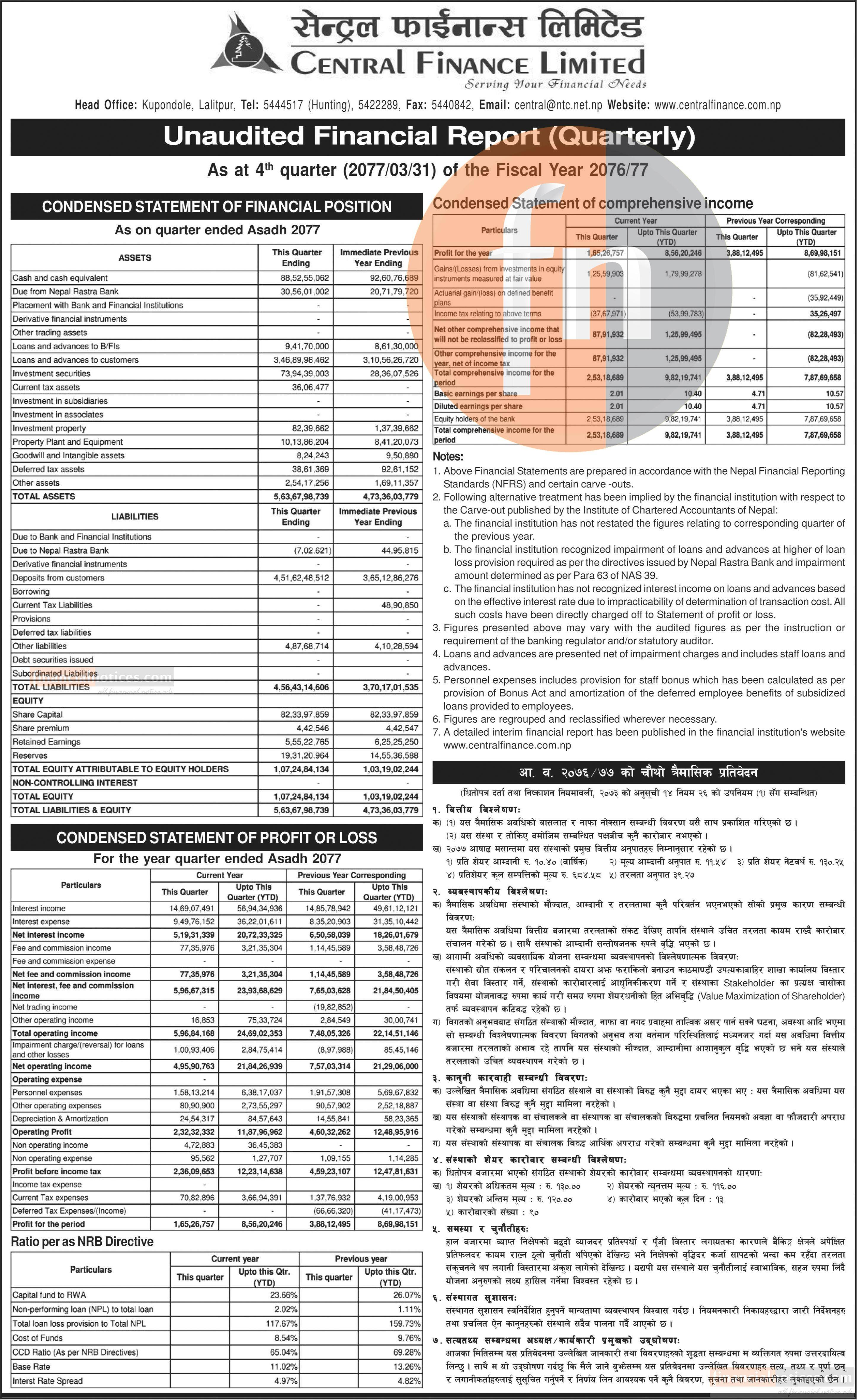 सेन्ट्रल फाइनान्सको चौथो त्रैमासको वित्तीय विवरण सार्वजनिक