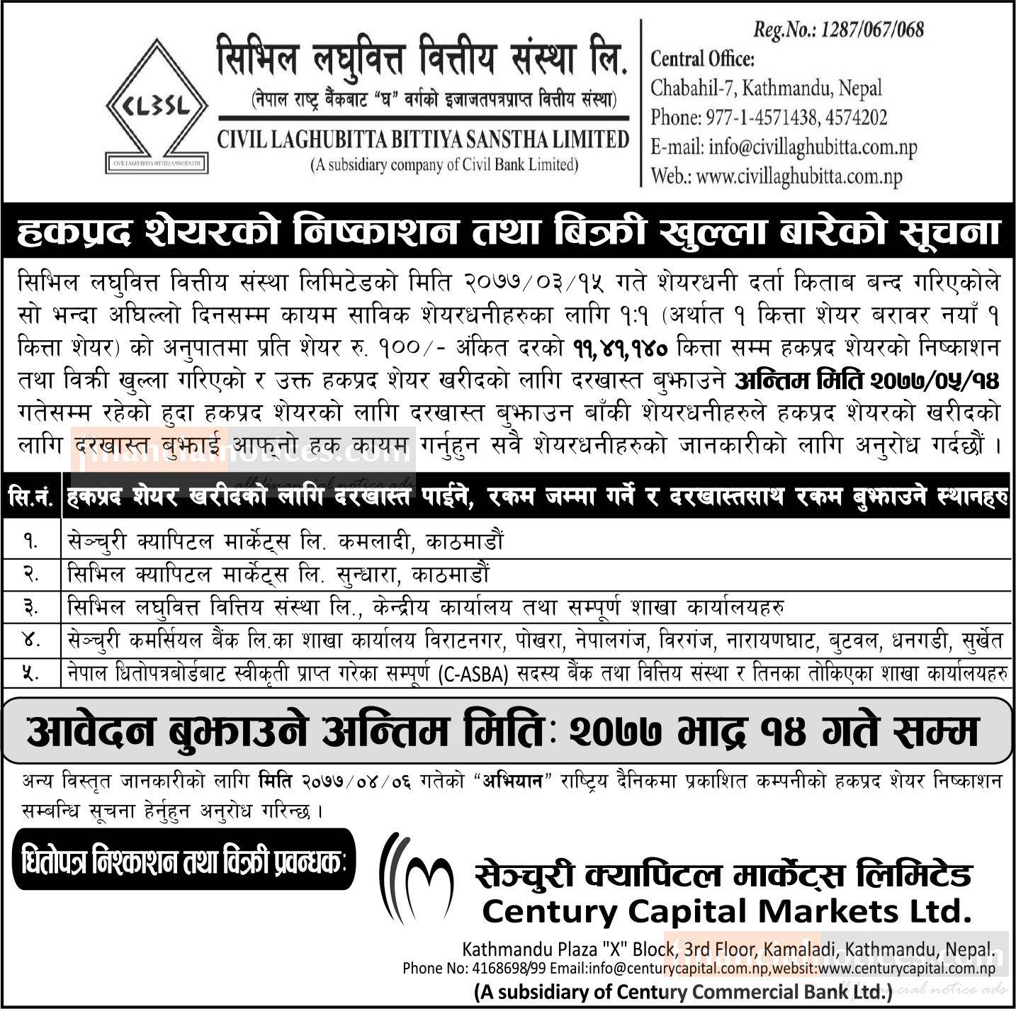 हकप्रद शेयर निष्काशन तथा बिक्री खुल्ला सम्बन्धी सूचना