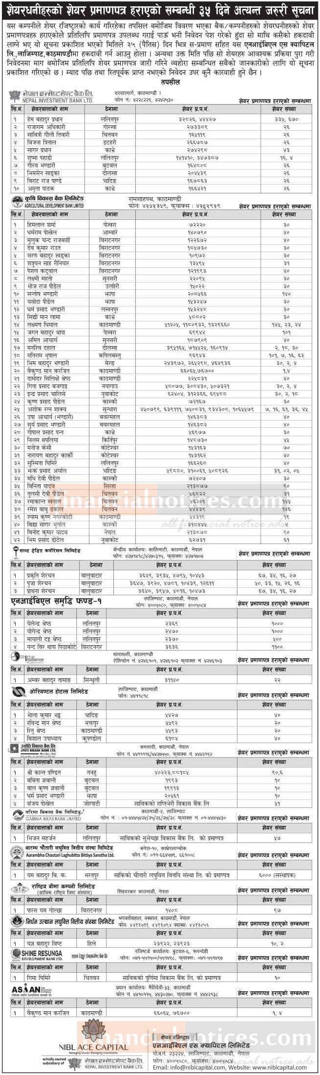 शेयर प्रमाणपत्र हराएको बारे सूचना