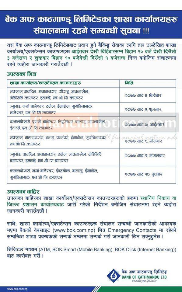BOK को शाखा कार्यालयहरू खुल्ला रहने सम्बन्धी सूचना !!!