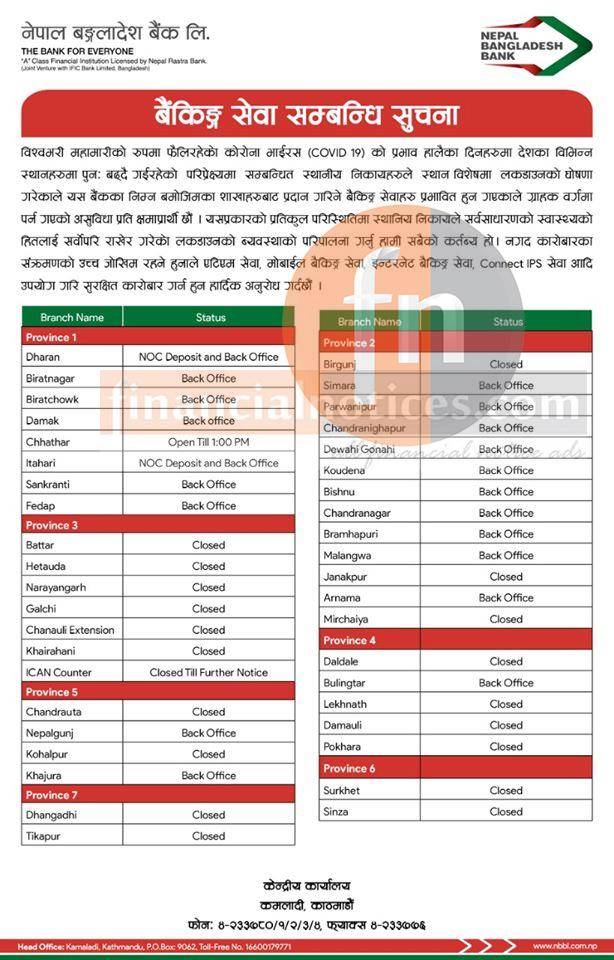 नेपाल बंगलादेश बैंकको खुल्ला रहने शाखहरु (काठमाडौं भ्याली बाहिर)