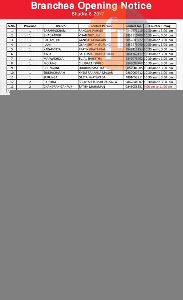 सनराइज् बैंककोे खुल्ला रहने शाखाहरु सम्बन्धी सूचना