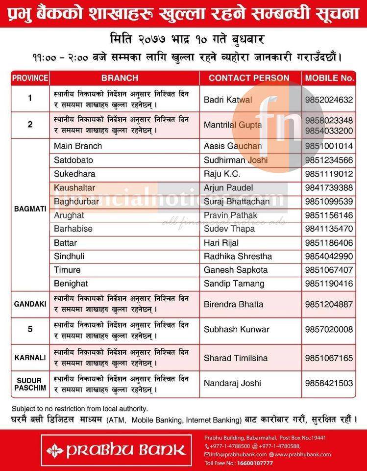 प्रभु बैंककोे खुल्ला रहने शाखाहरु सम्बन्धी सूचना