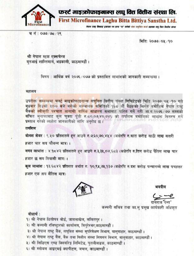 फर्स्ट माइक्रोफाईनान्सको लाभांश घोषणा सम्बन्धी सूचना