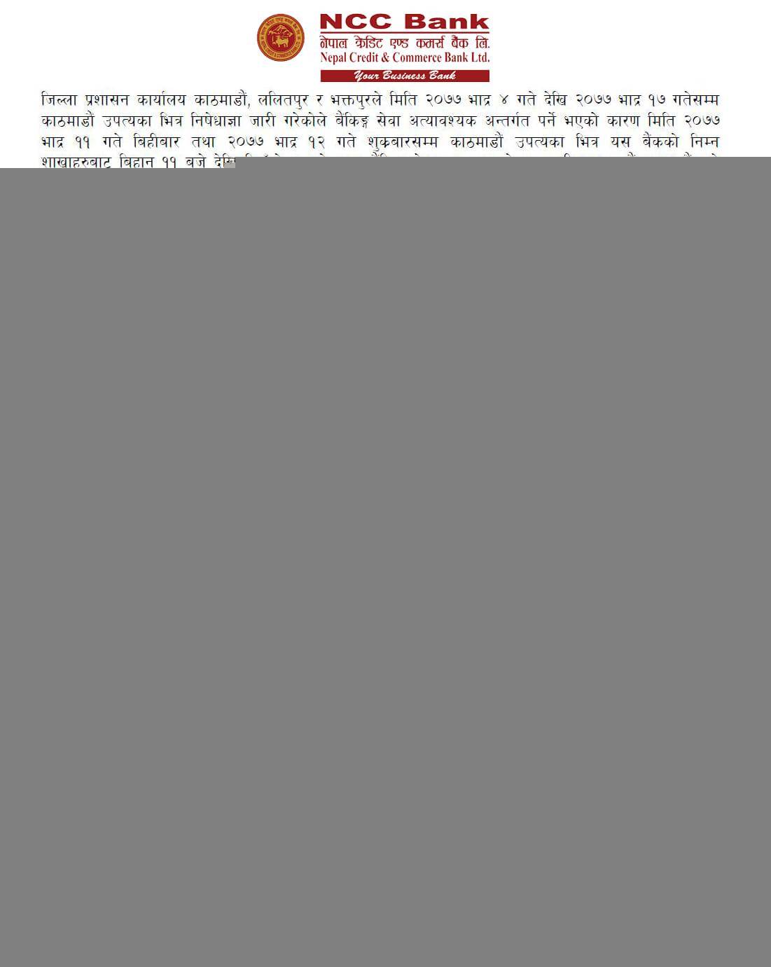 NCC  बैंक लिमिटेडको शाखा कार्यालयहरू खुल्ला रहने सम्बन्धी सूचना !!!