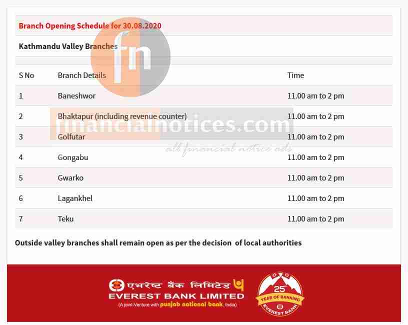 एभरेष्ट बैंकको आज खुल्ला रहने शाखा समयबारे सूचना