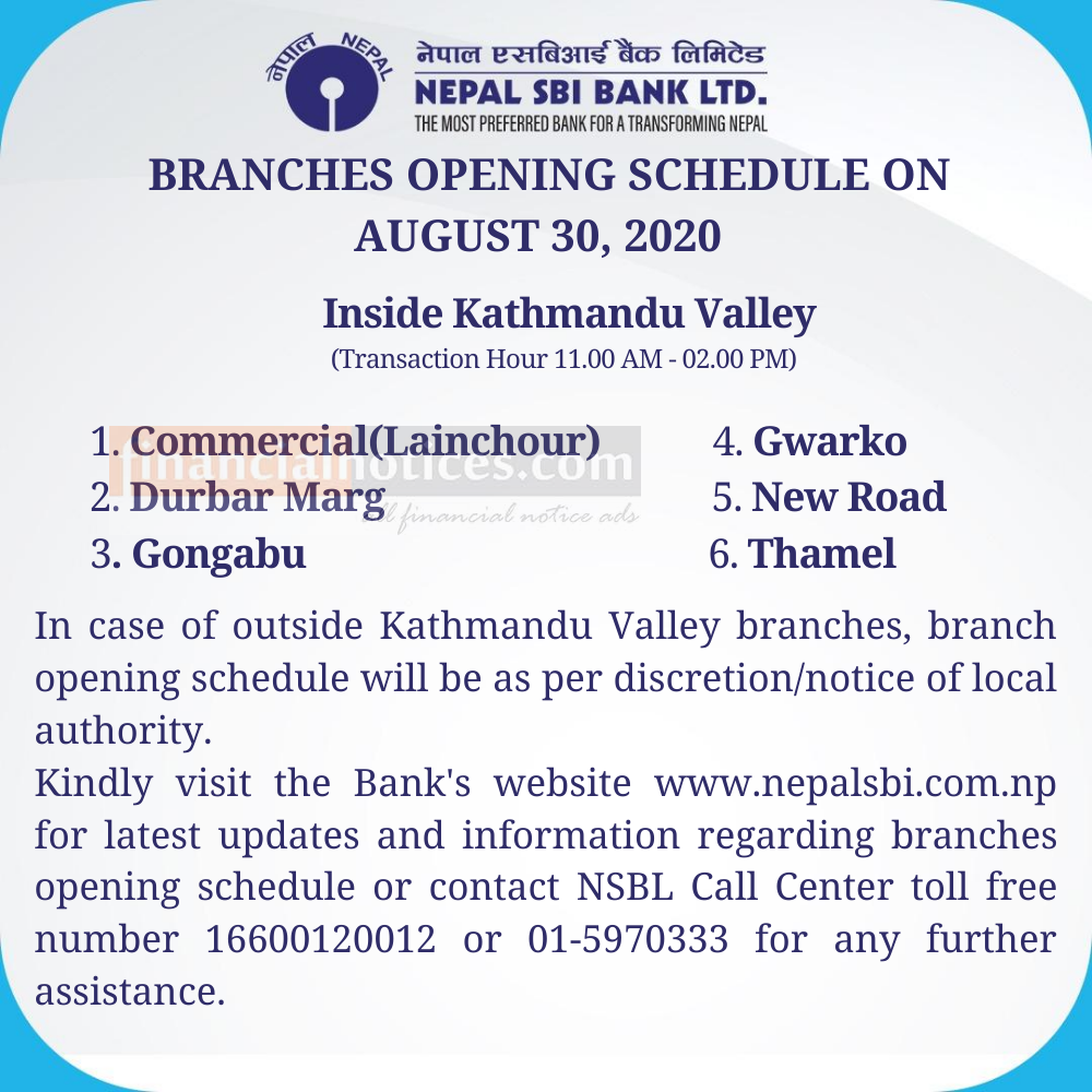 Nepal SBI बैंकका खुल्ला रहने शाखाहरु बारे सूचना