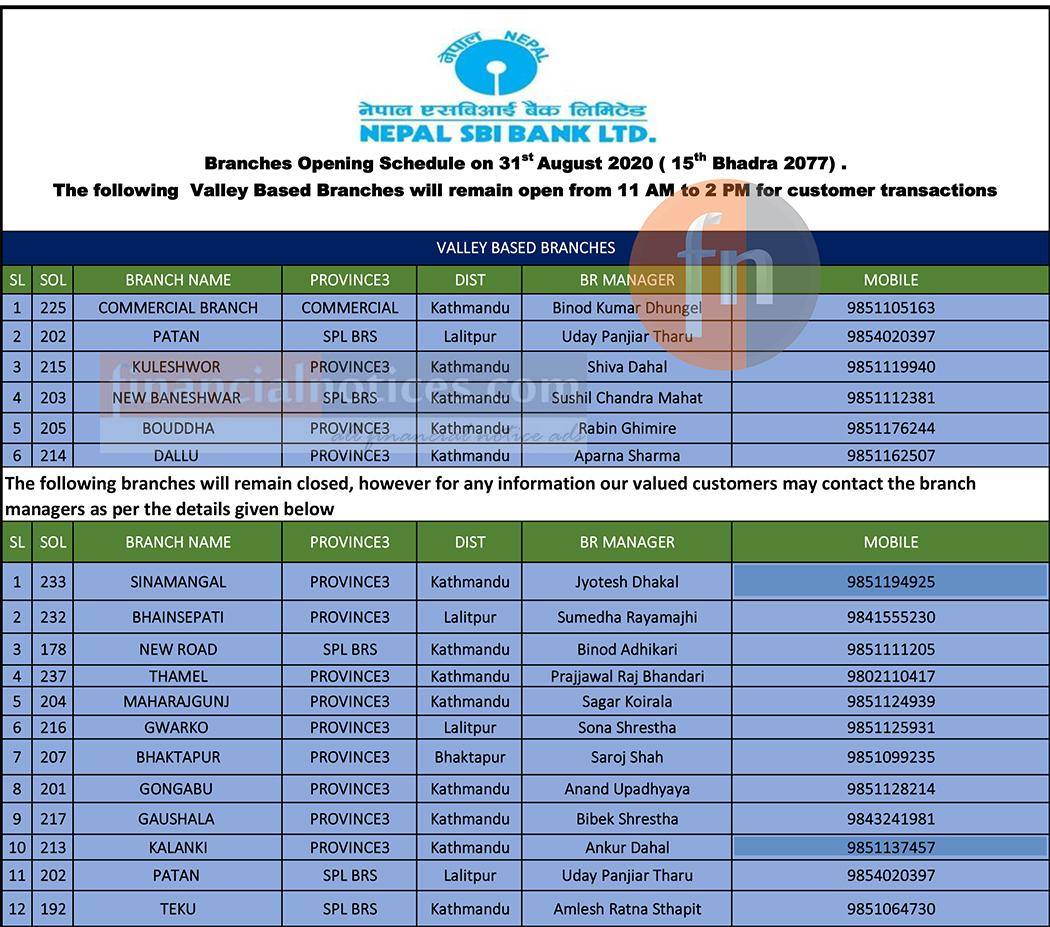 Nepal SBI बैंकका खुल्ला रहने शाखाहरु बारे सूचना