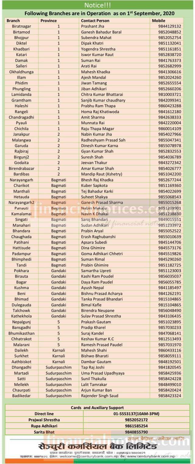 Century बैंकका खुल्ला रहने शाखाहरु बारे सूचना