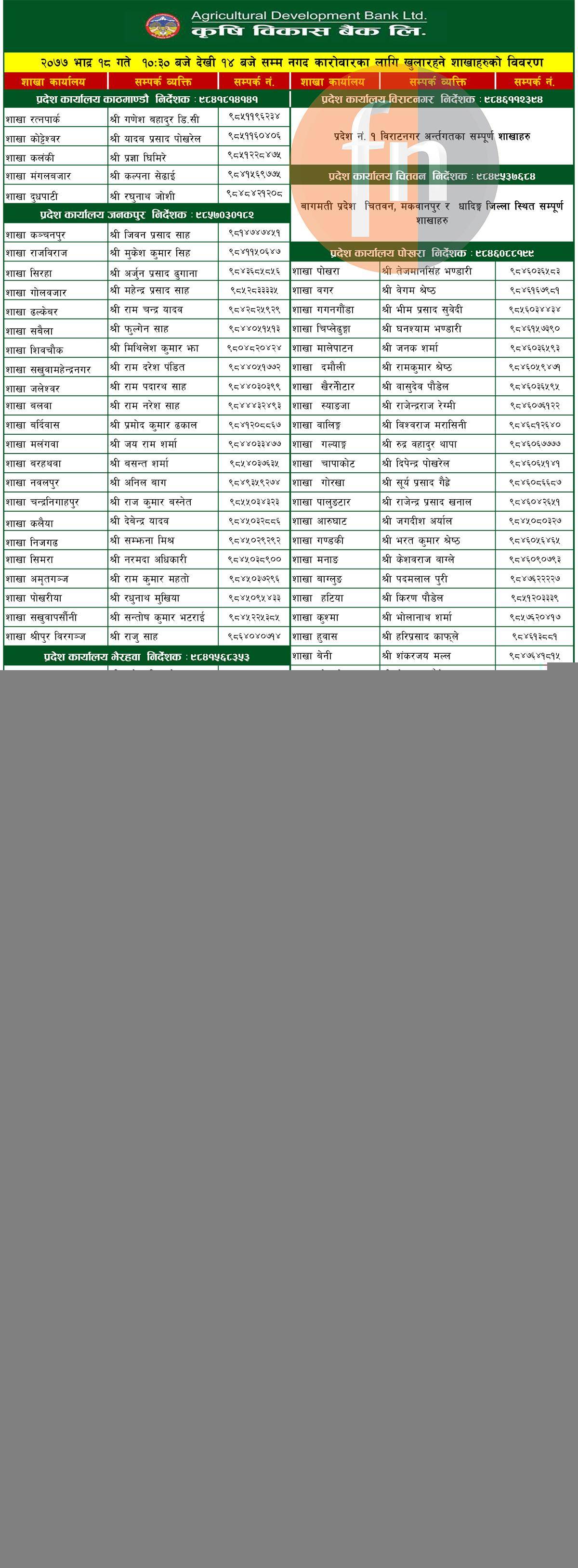 कृषि विकास बैंकको आज खुल्ला रहने शाखाहरु