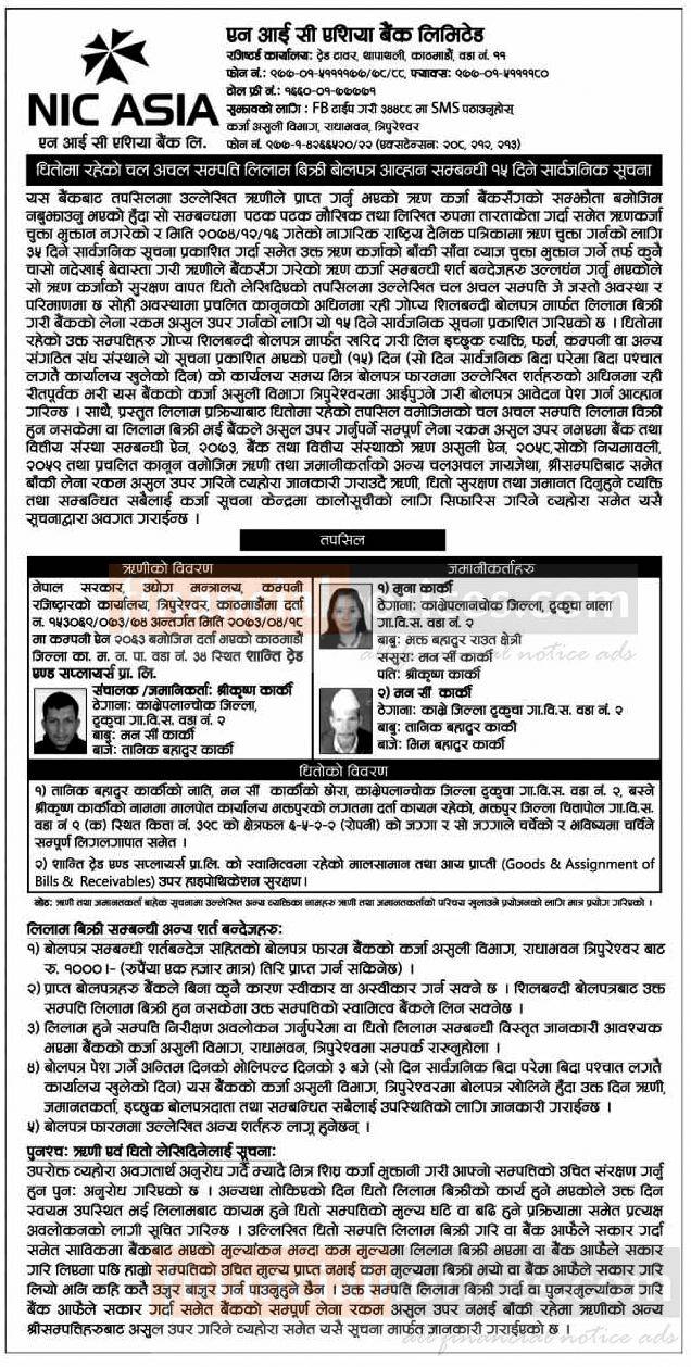 धितोमा रहेको चल अचल सम्पत्ती लिलामी विक्रिको सूचना