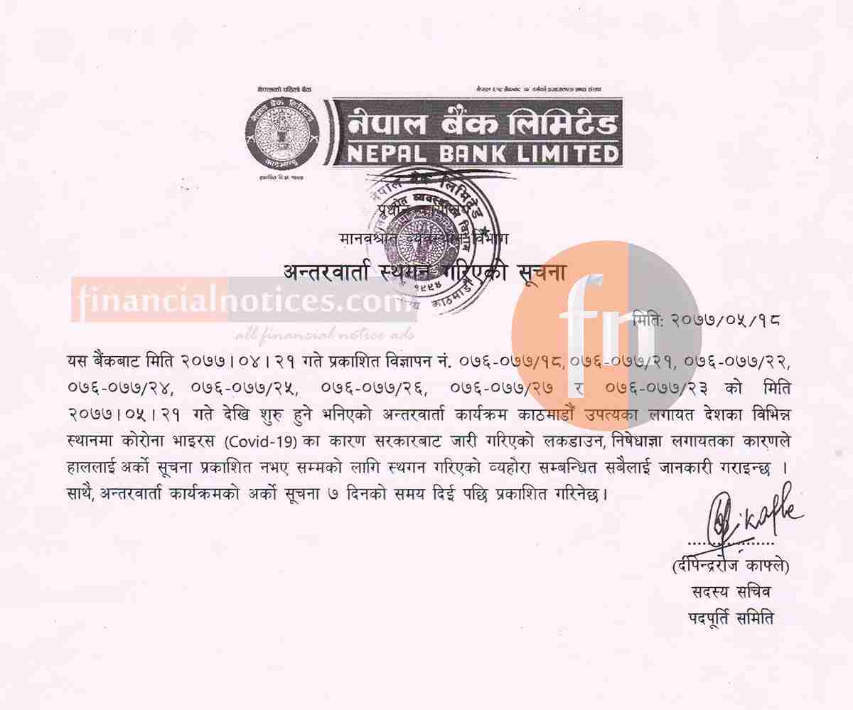 नेपाल बैंकको अन्तर्वार्ता स्थगन गरिएको सूचना