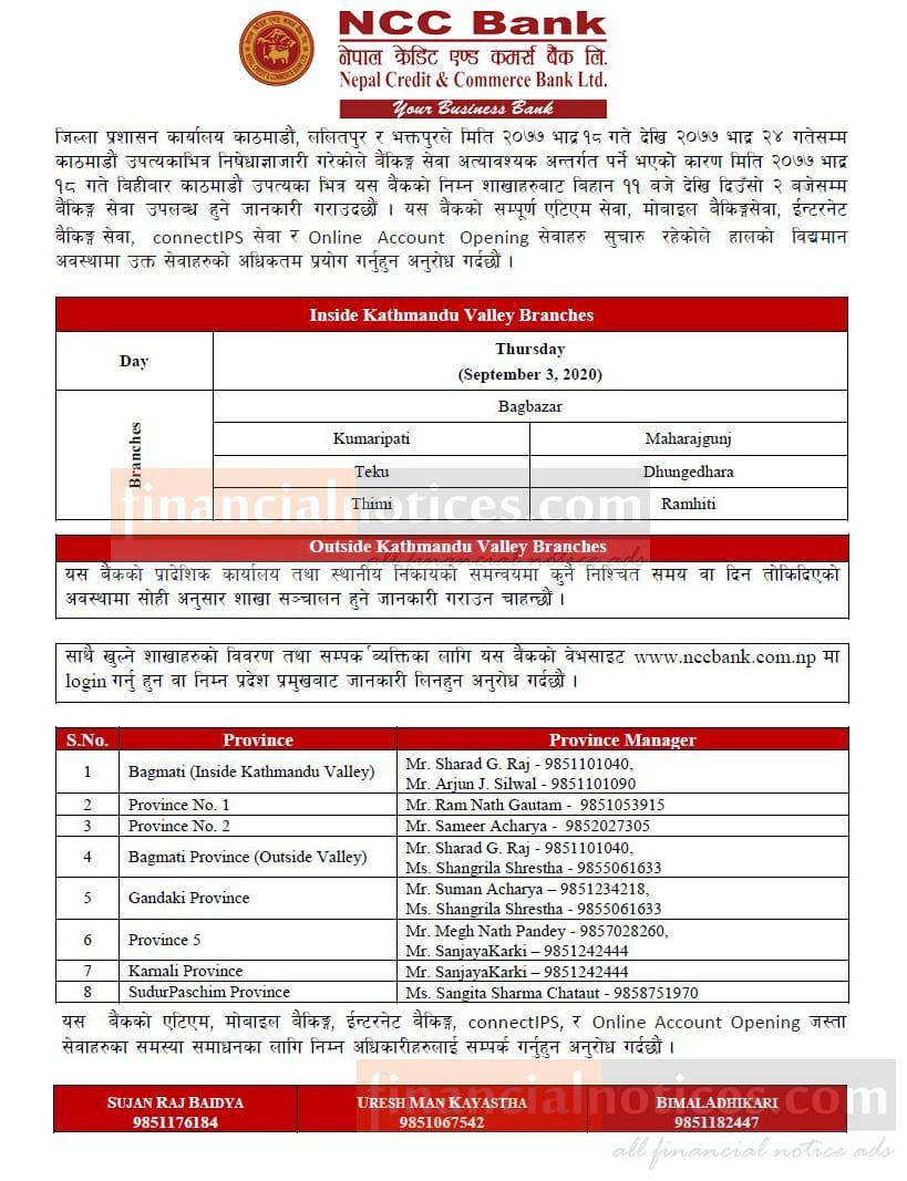 NCC बैंकको शाखा कार्यालयहरू खुल्ला रहने सम्बन्धी सूचना !!!