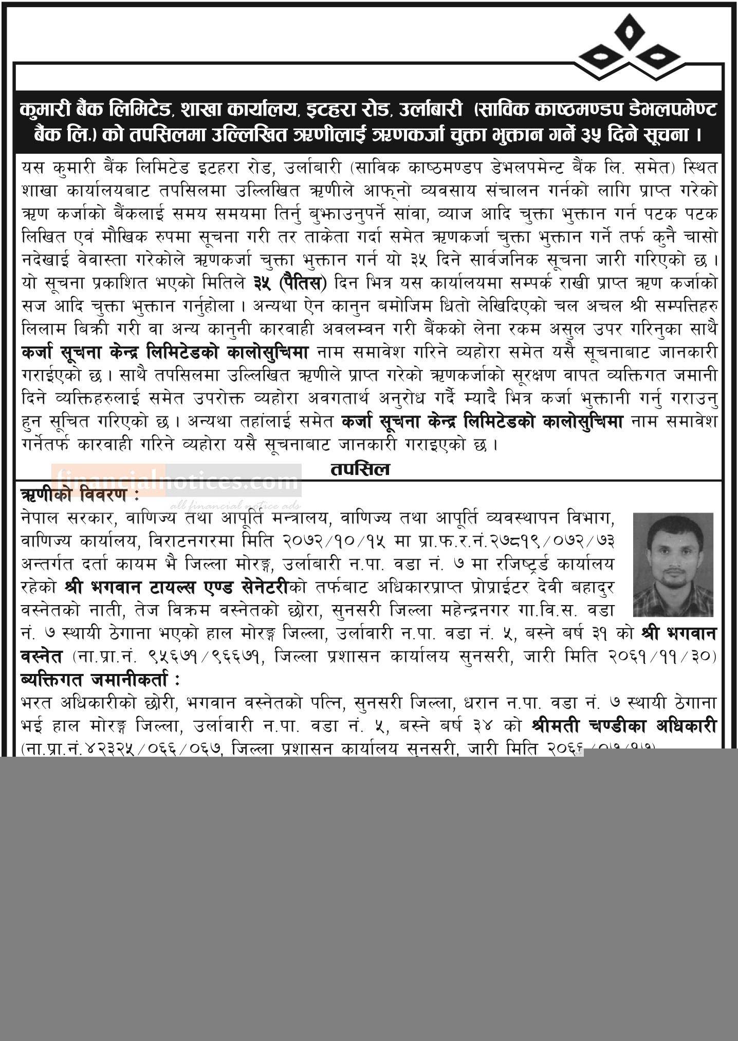 Kumari Bank Auction Notice for Non-Banking Assets at Mahendranagar, Kanchanpur -