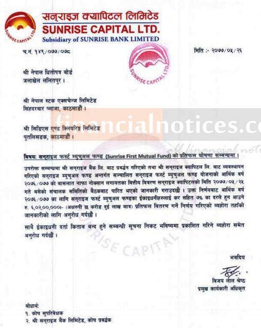 सनराइज फर्स्ट म्युचुअल फण्डले लाभांश घोषणा गरेको सूचना