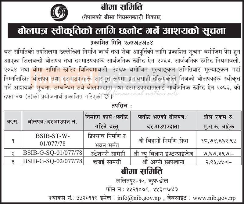 बोलपत्र स्वीकृतिको लागि छनोट भएको आशयको सूचना
