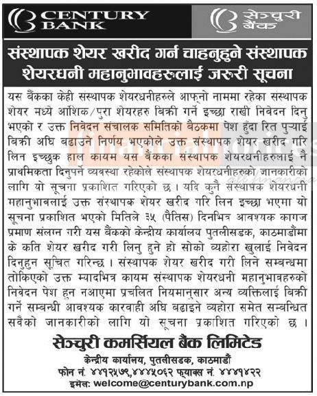 Published by Century Bank Ltd. Rajdhani Newspaper on 2075-2-27