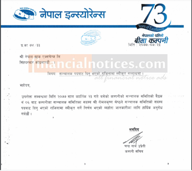 नेपाल इन्स्योरेन्सको सञ्चालक सदस्य श्रेष्ठको राजीनामा स्वीकृत सम्बन्धी सूचना