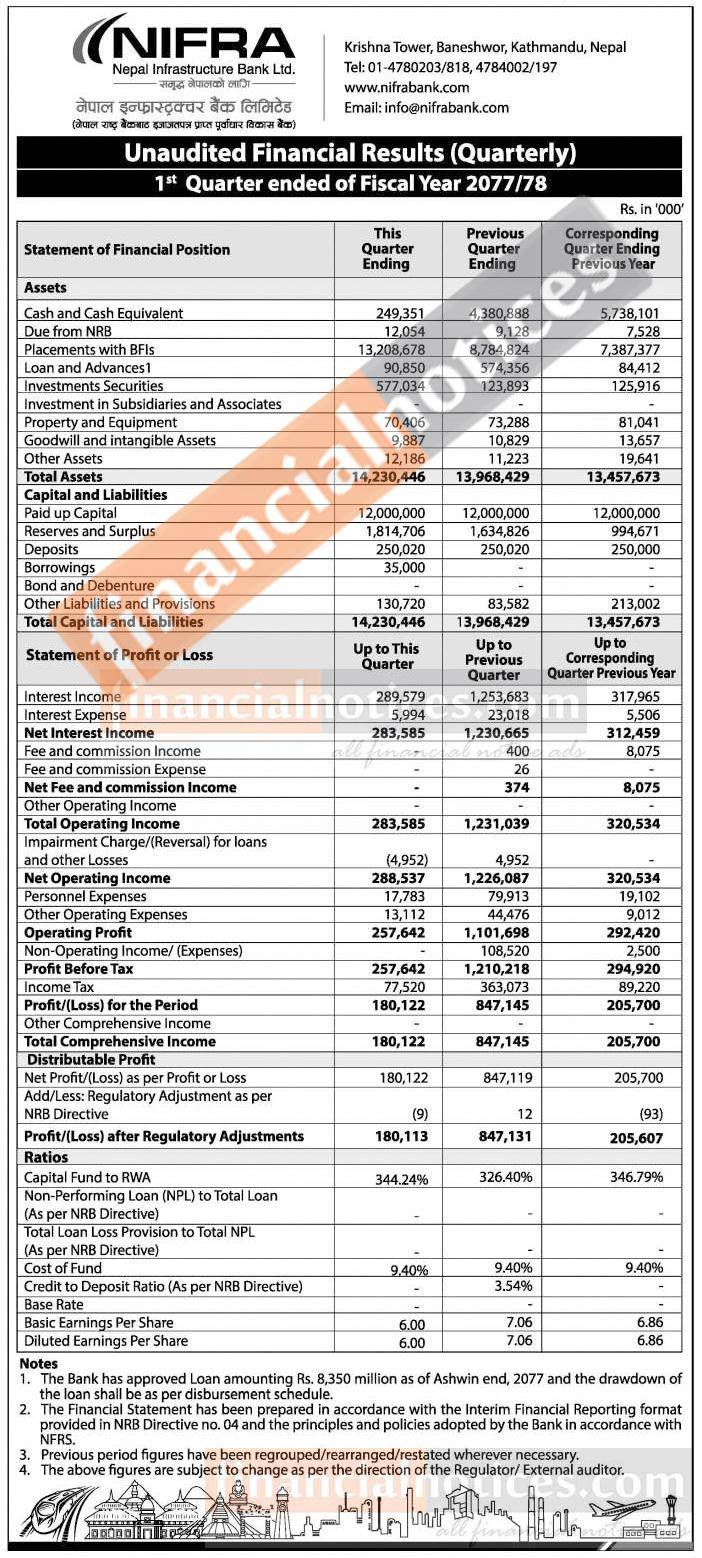 नेपाल इन्फ्रास्ट्रक्चर बैंकको खुद नाफा १८ करोड १ लाख १३ हजार रुपैयाँ (1st Quarterly Reports)