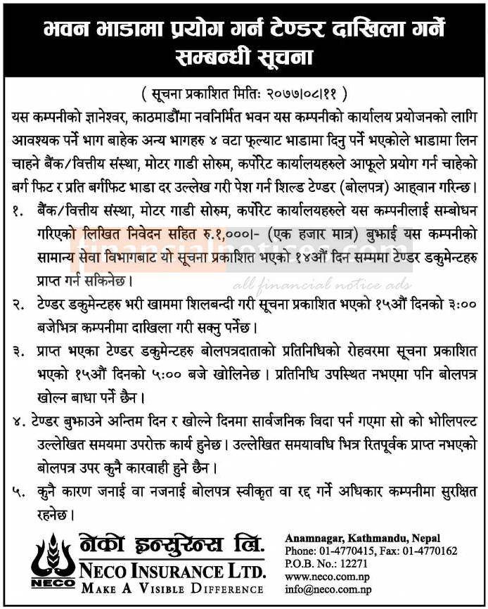 भवन भाडामा प्रयोग गर्न टेण्डर दाखिला गर्ने बारे सूचना