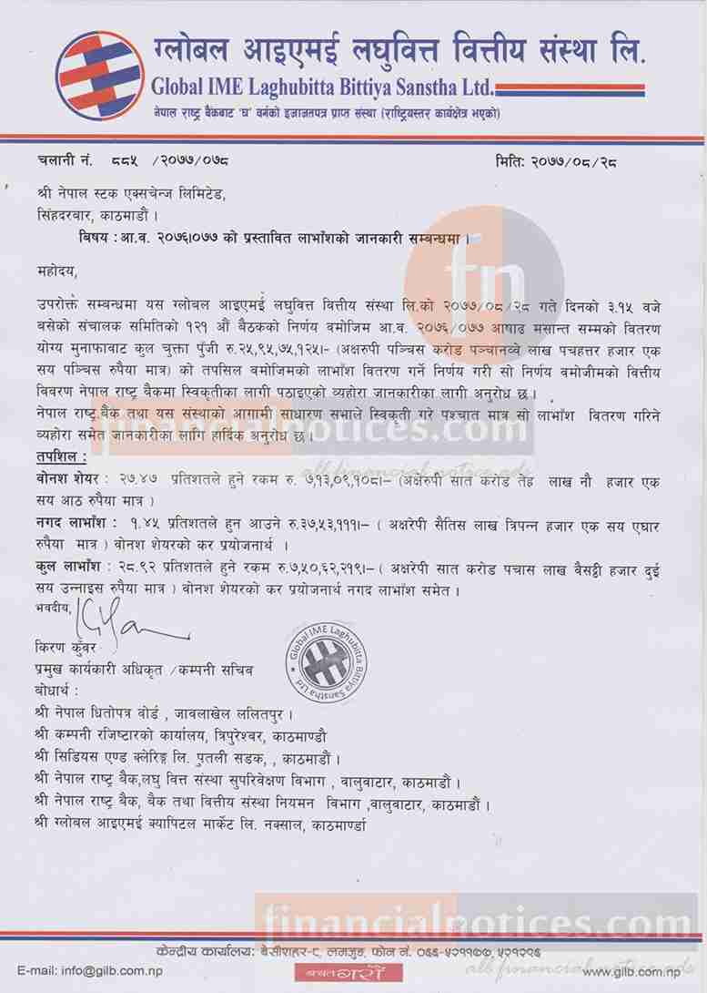 ग्लोबल आईएमई लघुवित्तको लाभांश घोषणा