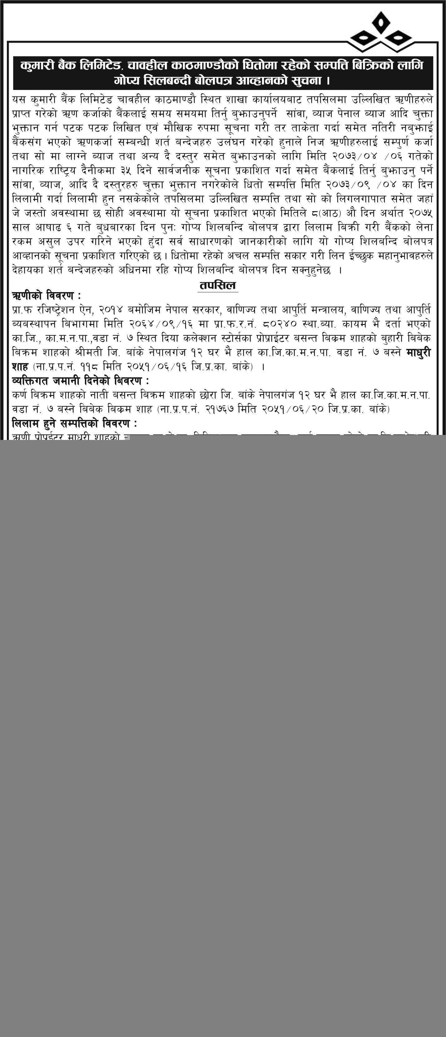 Kumari Bank Auction Notice for Non-Banking Assets at Mahendranagar, Kanchanpur -