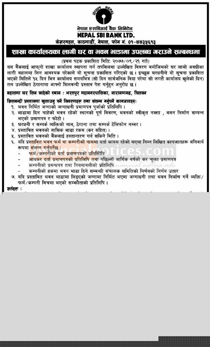 शाखा कार्यालयको लागि घर भाडामा लिने बारे सूचना