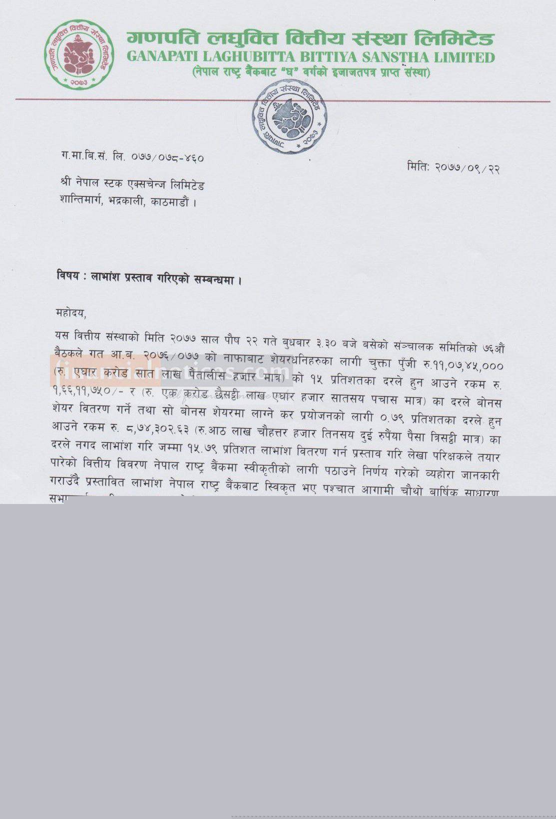 Ganapati Laghubitta (GMFBS) proposes 15.79% dividend for FY 2076/77.