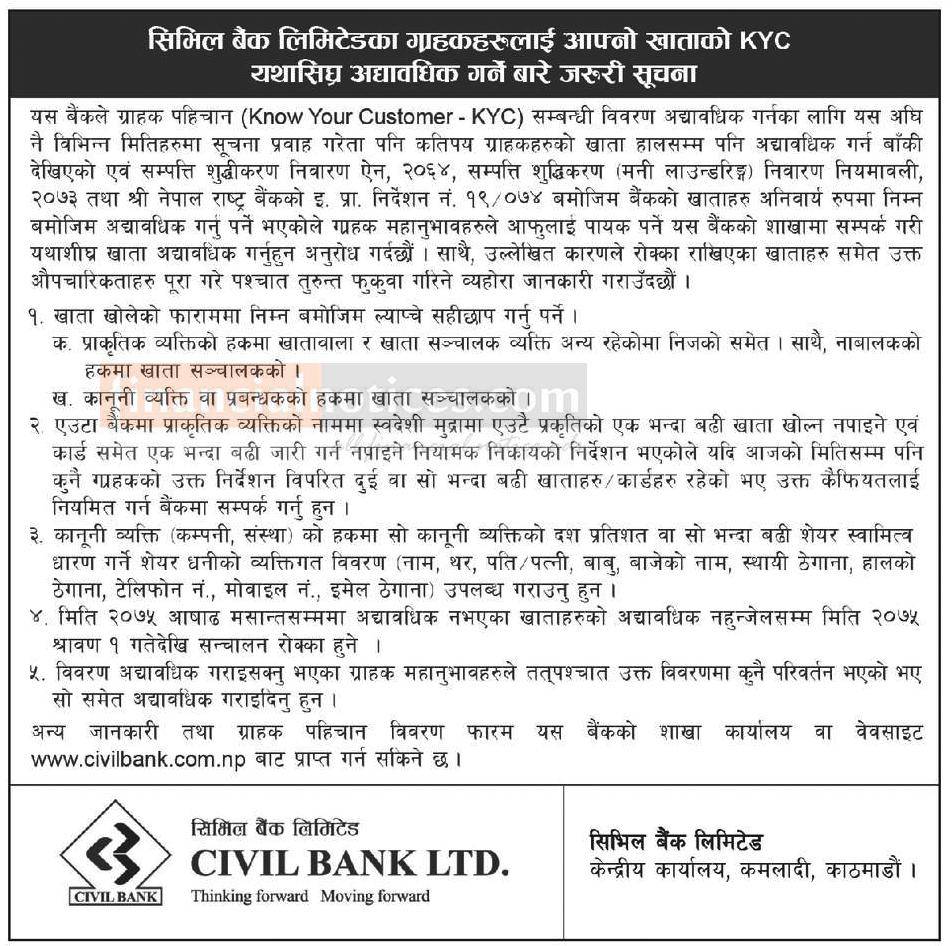 Published by Civil Bank Limited Kantipur Newspaper on 2075-3-06