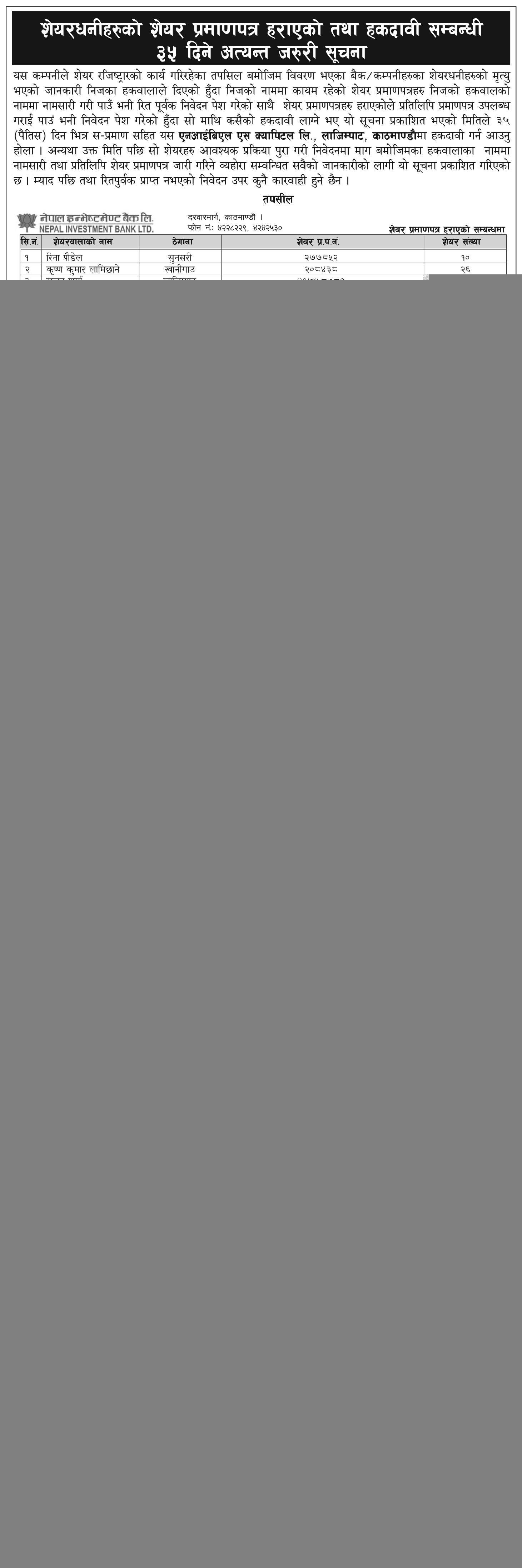 शेयर प्रमाणप पत्रको लागि हकदावीको सूचना