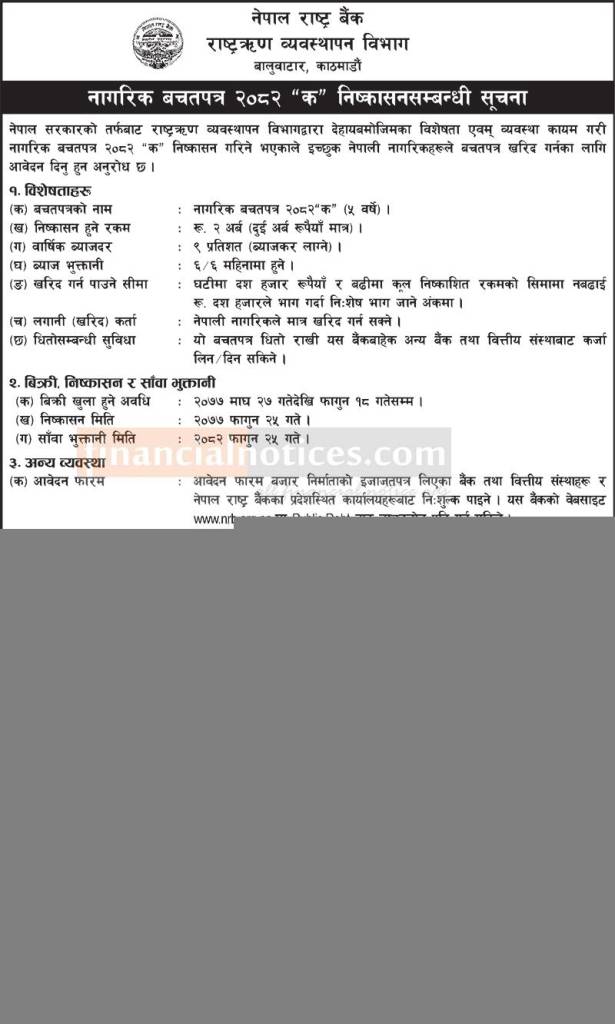 नागरिक बचतपत्र २०८२ ''क'' निष्काशन सम्बन्धी सूचना
