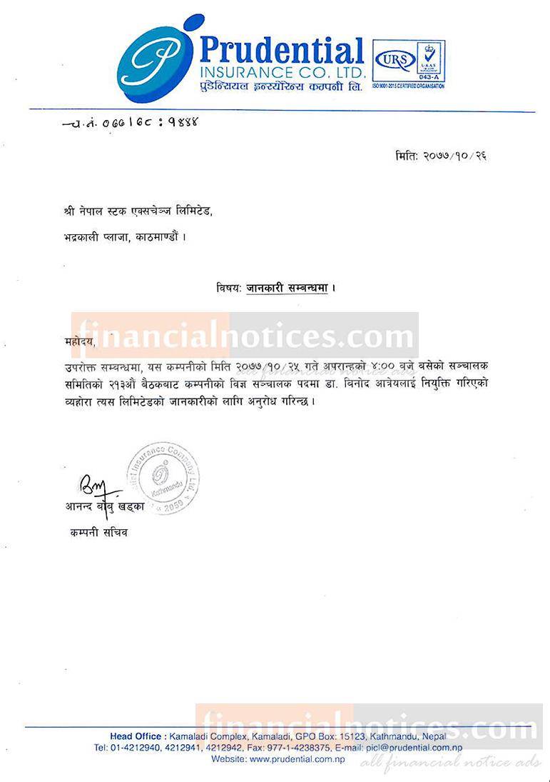 प्रुडेन्सियल इन्स्योरेन्स कम्पनीको संचालक पदमा विनोद आत्रेयलाई नियुक्ति गरिएको सूचना