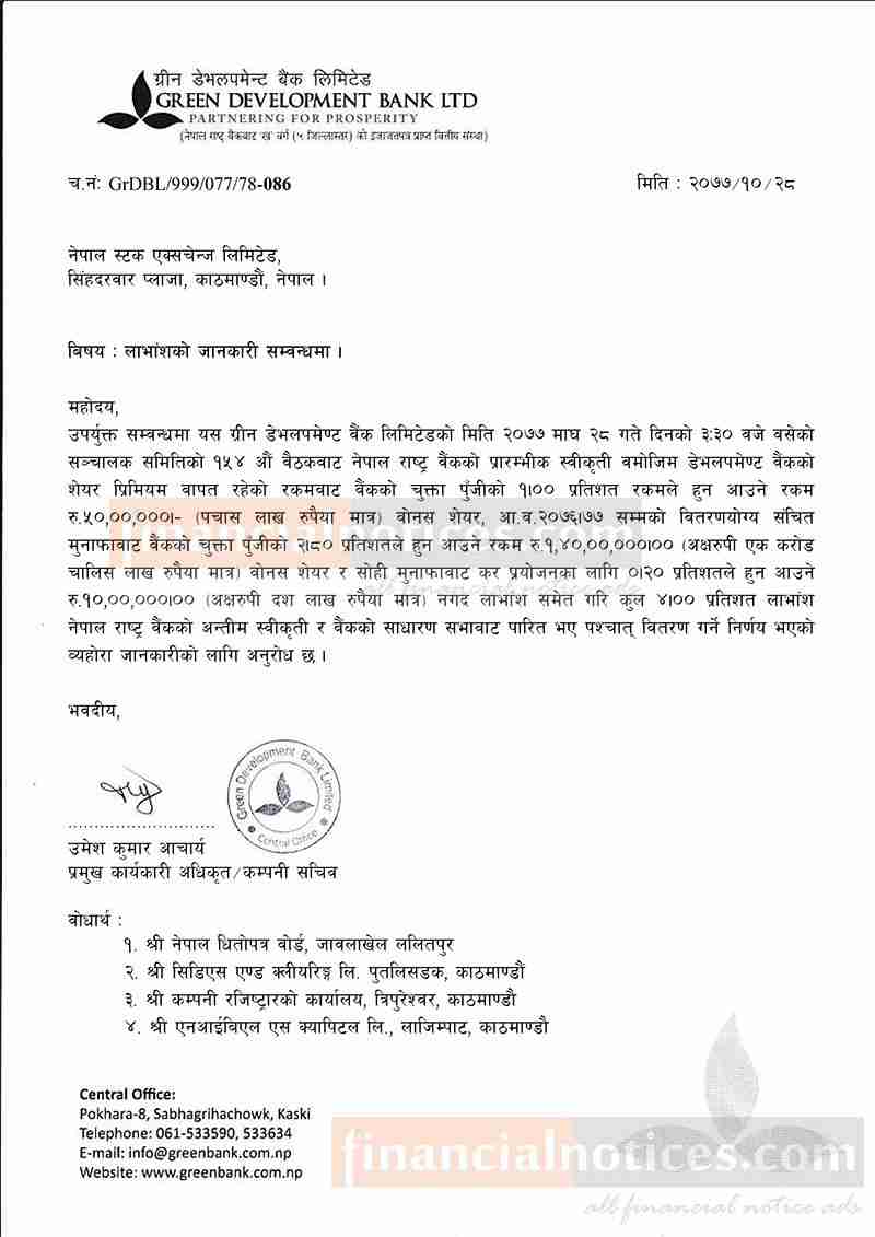 ग्रीन डेभलपमेण्ट बैंकको लाभांश संशोधन सम्बन्धी सूचना