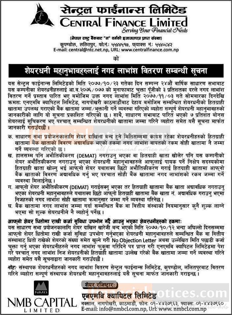 शेयरधनी महानुभावहरुलाई नगद लाभांस वितरण सम्बन्धी सूचना
