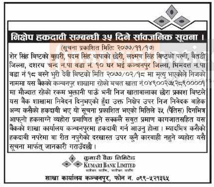 निक्षेप हकदावी सम्बन्धी ३५ दिने सूचना