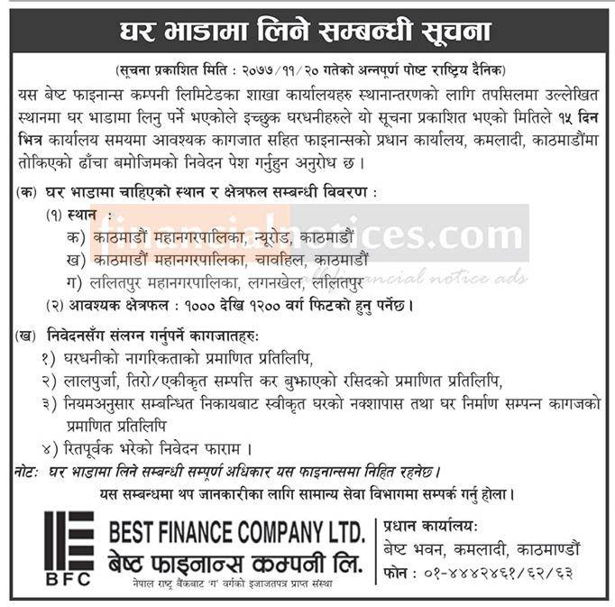 घर भाडामा लिने सम्बन्धी सूचना