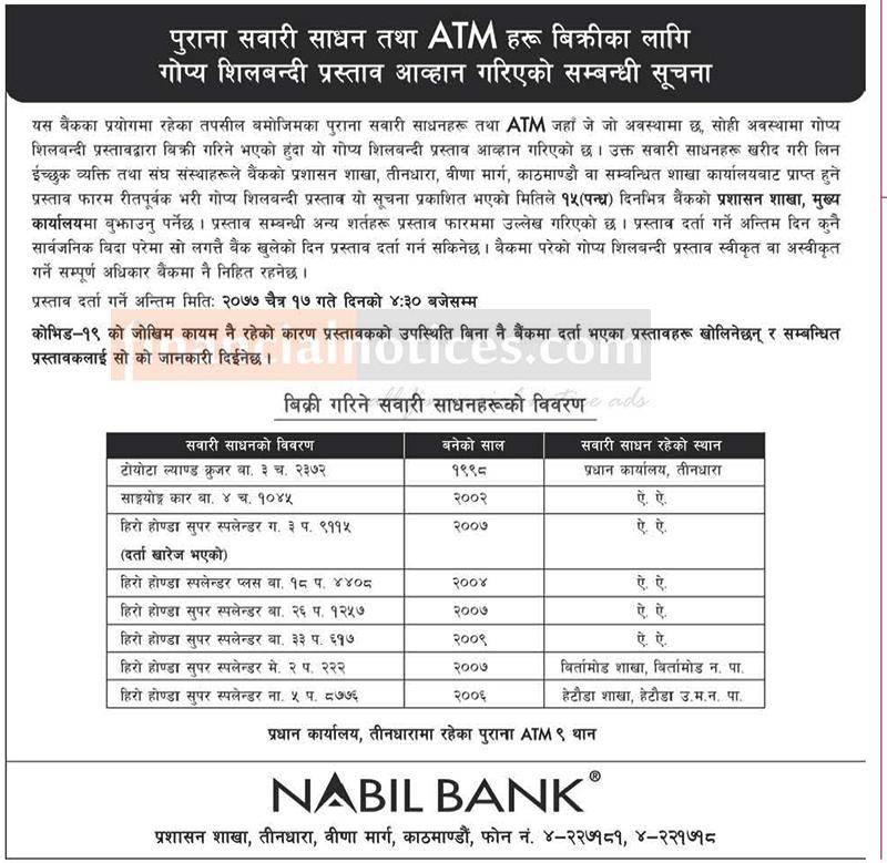 पुरानो सवारी साधन तथा ATM बिक्रिका लागि शिलबन्धी प्रस्ताव आव्हान गरिएको सूचना