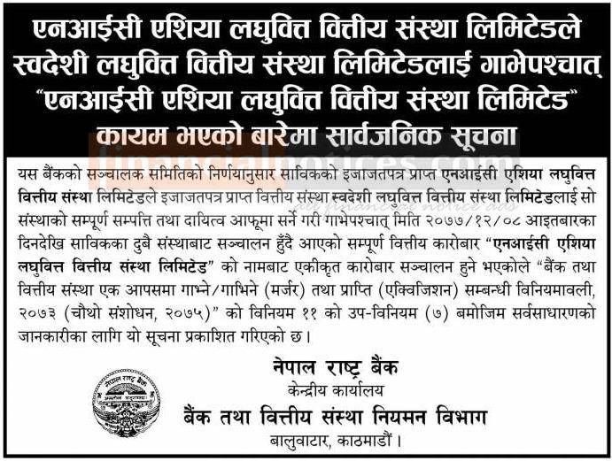 एनआईसी एशिया र स्वदेशी लघुवित्त मर्जरपश्चात नाम भने एनआईसी एशिया लघुवित्त रहने बारे सूचना