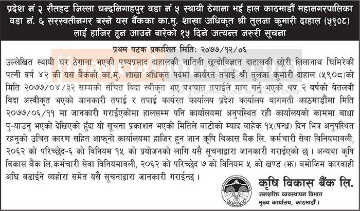 शाखा अधिकृत श्री तुलजा कुमारी दाहाल लाई हाजिर हुन आउने बारे सूचना