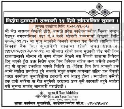 निक्षेप हकदावी सम्बन्धी ३५ दिने सार्वजनिक सूचना
