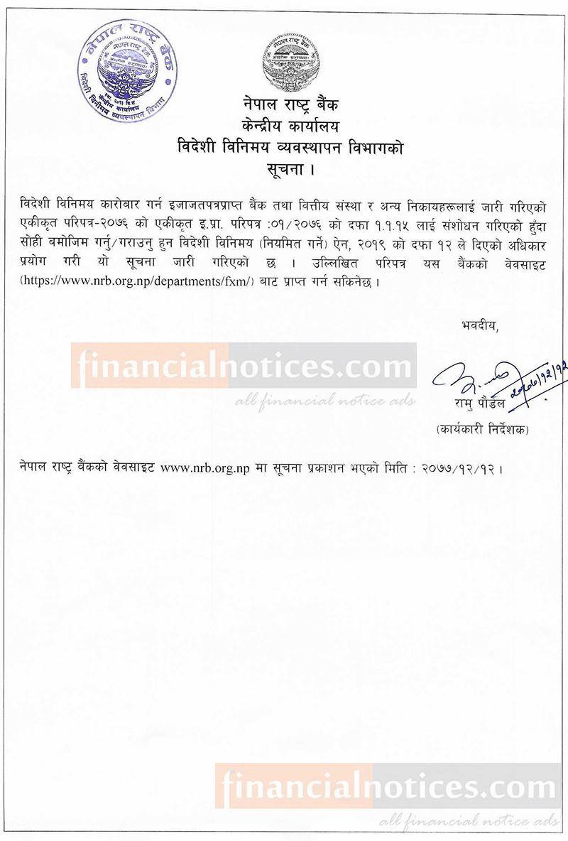 विदेशी विनिमय कारोबार गर्न बैंक तथा वित्तीय लाई जारी गरिएको एकीकृत परिपत्र संशोधनको सूचना