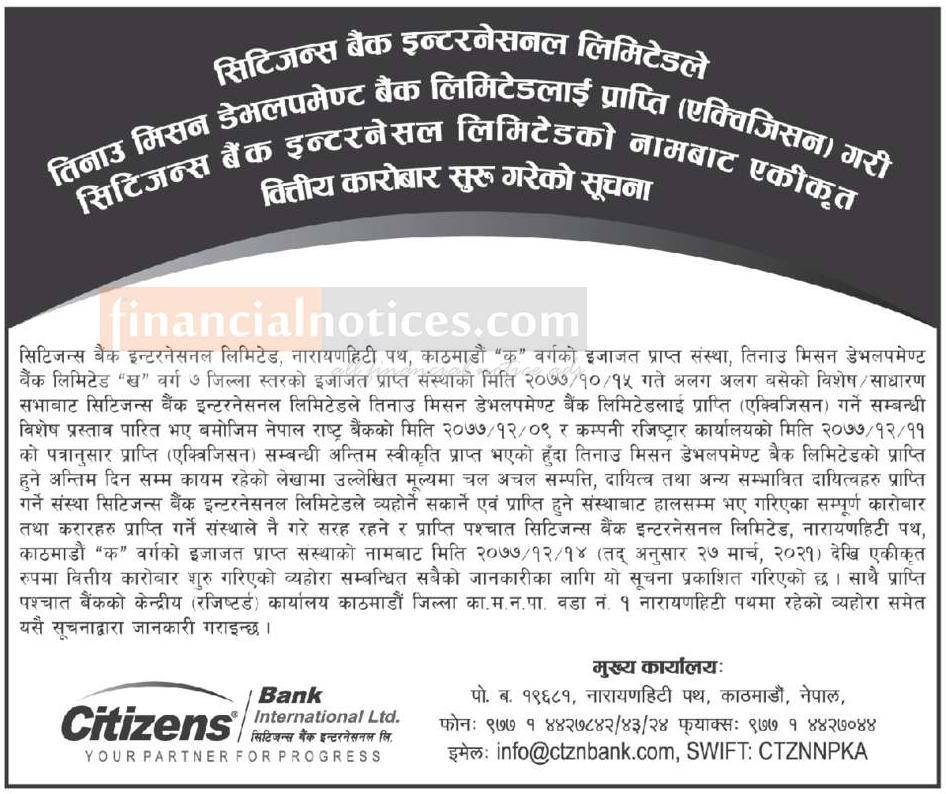 सिटिजन्स बैंक र तिनउ मिसन डेभलपमेन्ट बैंकको एकिकृत कारोबार सम्बन्धी सूचना