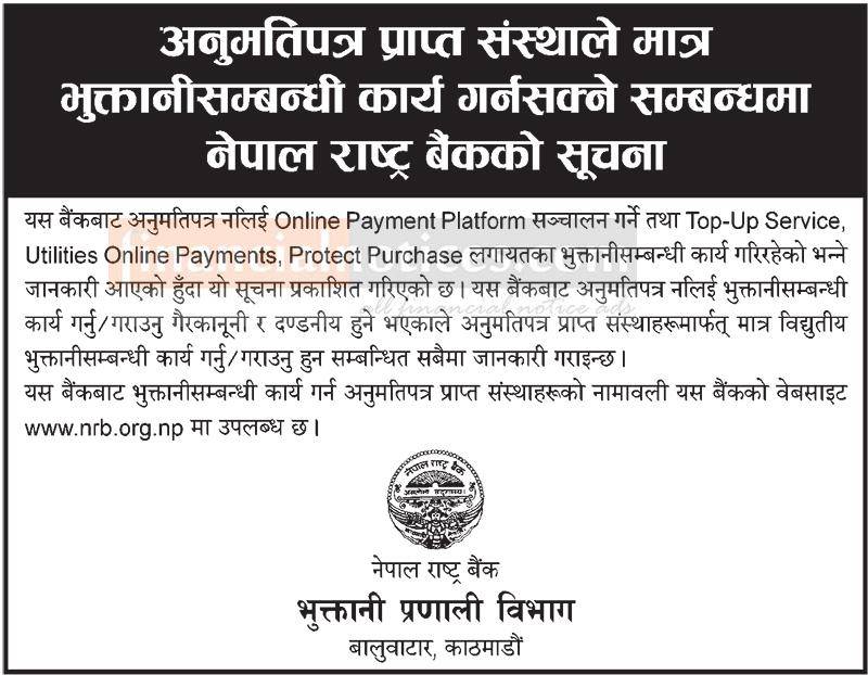 अनुमतिपत्र प्राप्त संस्थाले मात्र भुक्तानी सम्बन्धी कार्य गर्न सक्ने बारे सूचना